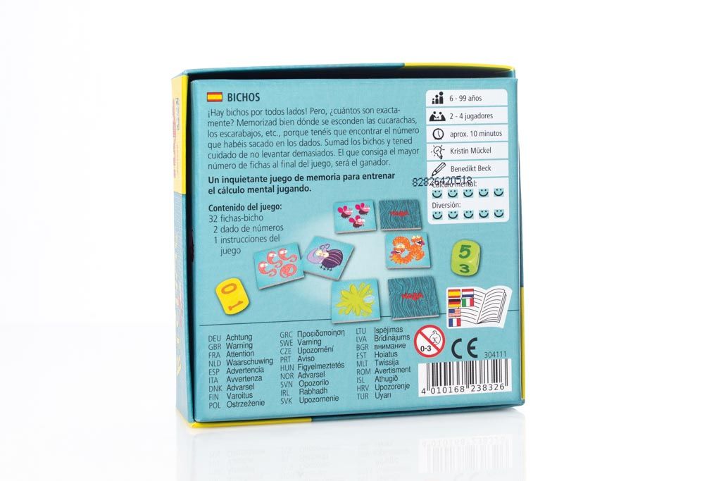 Bichos es un juego de memoria donde los participantes tendrán que estar atentos para determinar en donde se han escondido lo diferentes insectos que han infestado el lugar. Según el número proporcionado por el dado, el jugador deberá encontrar esta cantidad de bichos para poder mantenerse dentro del juego.